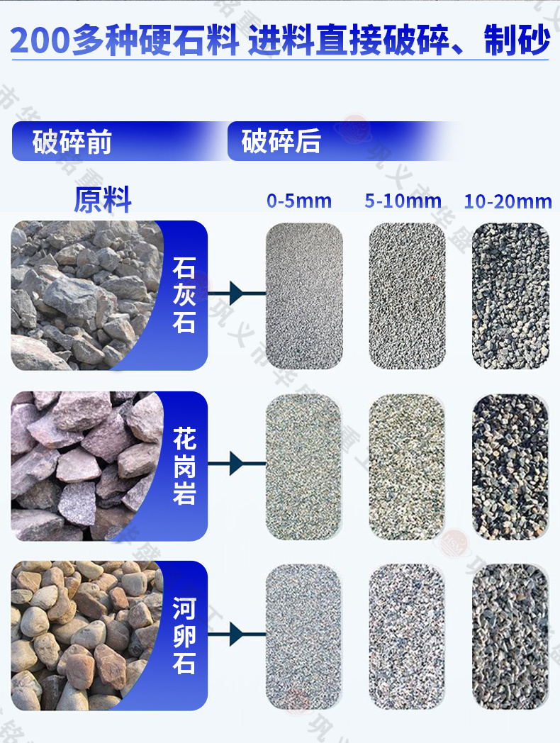 河卵石、方解石、石英、玻璃、大理石、鵝卵石、膨潤土、鐵礦石、青石、山石、石灰石、風化砂、輝綠巖、花崗巖、玄武巖等物料的破碎制砂工作。